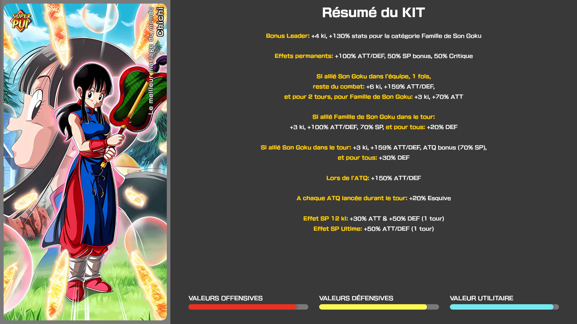 Ses dégâts seront très bons avec Goku, même si très aléatoires, et niveau défensif, vu qu’elle lance plusieurs attaques dans le tour et que Chichi récupère de l’Esquive à chacune de ces attaques, elle s’en sort vraiment pas mal.