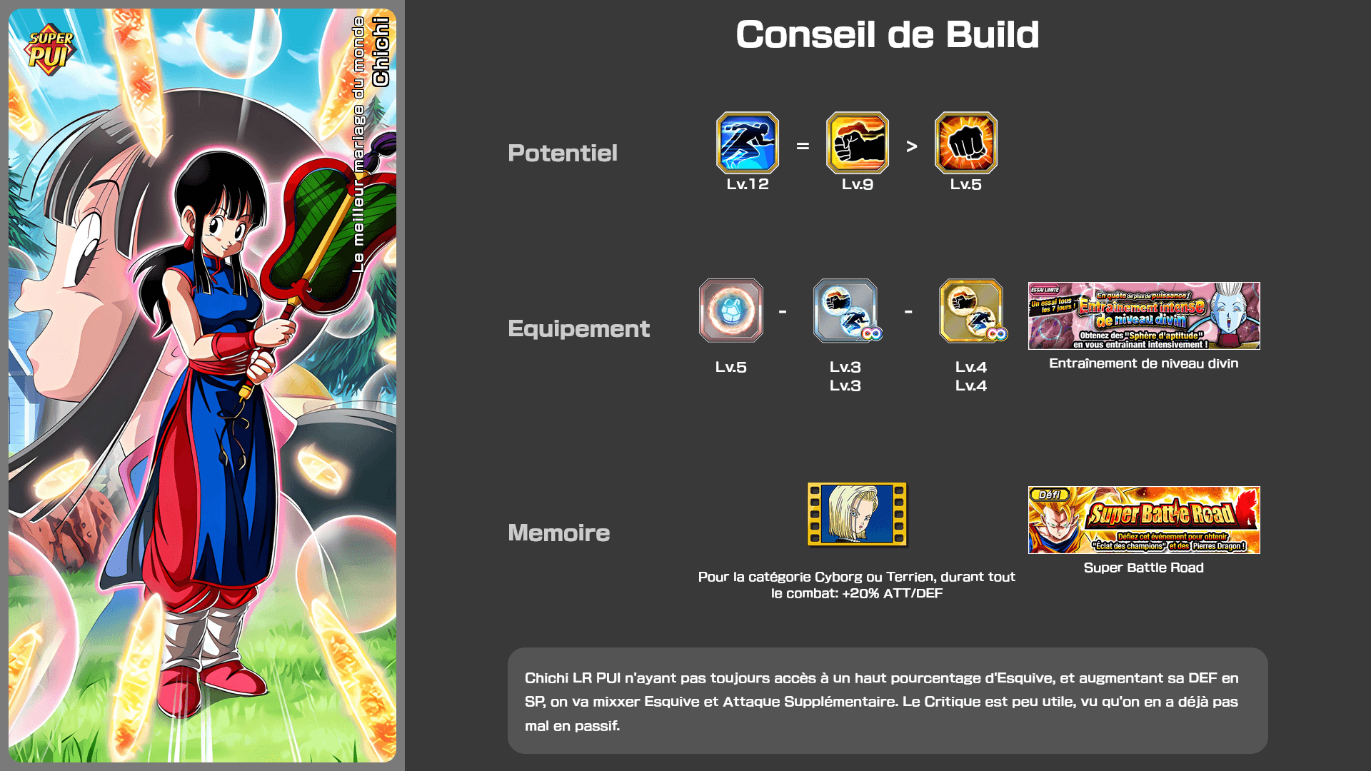 Chichi PUI est un LR Free to play du Tenkaichi Budokai, sortie en Octobre 2025. Elle est pensée pour être jouée aux cotés d’un Goku, ce qui lui permet de débloquer énormément de bonus, à un point où que sans Goku, elle ne sert pas à grand chose.